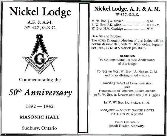 Historical Sketch of Nickel Lodge No 427 G.R.C., Sudbury, Ontario