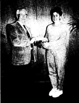 W. Bro. F. Gordon MacLeod presents the first Nickel Lodge Bursary to Susan Woodward, a second year student in the Nursing Programme at Cambrian College.