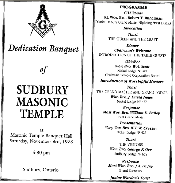 It is our sincere wish that as the Lodge prepares to enter the 21st Century, it will continue to lead and direct Masons in the Sudbury area, as it maintains its status as a focal point in strengthening masonic philosophy and teachings to generations yet unborn.
